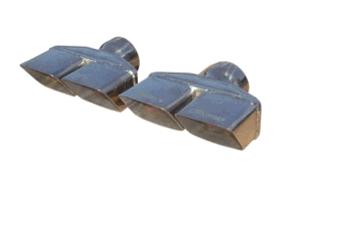 Potential Style 2: Similar to the Pypes tips shown below, 2.5" inlet -OR- 3" inlet, outlet is dual side by side rectangles 3.5" high by 3.7" wide, 1/4"separation, totaling 4" x 8" side by side. Two main differences from the Pypes tips: Edges of the outlets will be rolled (rather than cut like the Pypes), and there will be no narrowing of the inlet just past where the pipe enters it.